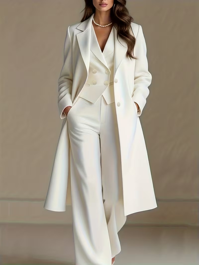 This sophisticated three-piece suit presents a refined layered look, featuring a longline tailored coat, structured double-breasted vest, and coordinating high-waist wide-leg trousers. Designed to reflect the elegant proportions shown in the silhouette, the set combines strong tailoring with fluid movement for a polished statement. The long coat adds dramatic structure, while the vest shapes the waist, and the trousers create an elongated, graceful line. Crafted from premium suiting fabric, it offers comfort, structure, and a smooth drape suitable for professional settings or elevated occasions. A standout ensemble designed for modern, confident dressing.